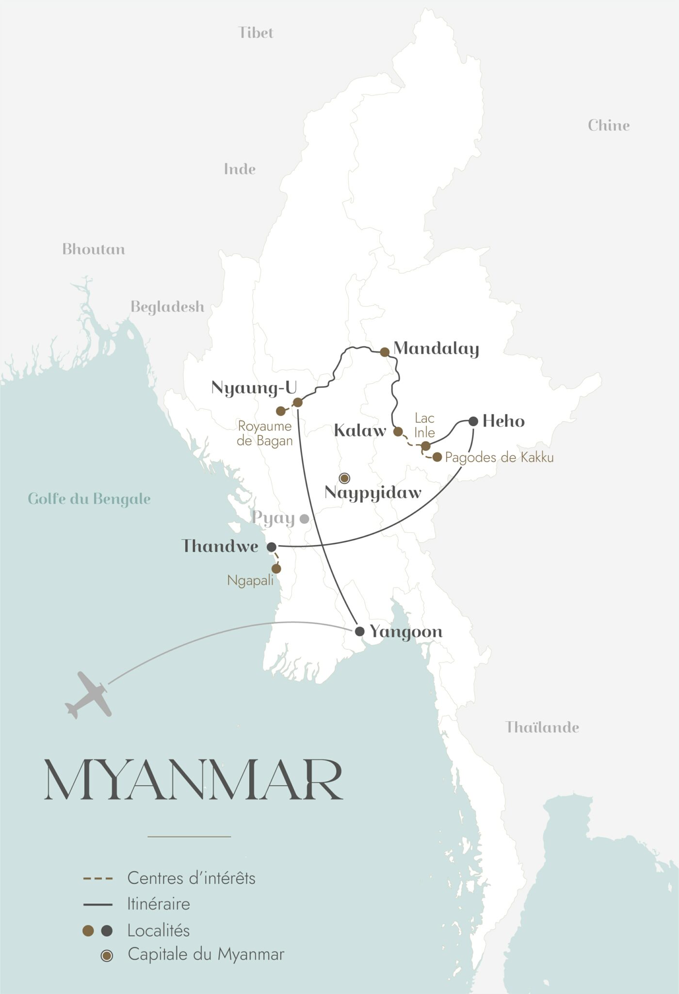 Enchassé entre l’Inde, la Chine et la Thaïlande, le Myanmar, ancienne colonie britannique appelée Birmanie, est un trésor de diversité géographique : des majestueuses montagnes de l’Himalaya birman aux vastes plaines centrales, en passant par les luxuriantes forêts tropicales et les côtes bordées de plages immaculées. C’est aussi un pays de contrastes où les traditions millénaires coexistent harmonieusement avec des influences modernes.